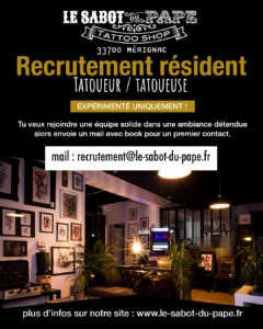 Le Sabot du Pape – 33700 Mérignac, propose un box équipé et des conditions de travail sympas dans un bel espace aux portes de Bordeaux.Entouré d’une équipe cool de 4 tatoueurs/tatoueuses. Le shop te propose la mise à disposition d’1 box individuel et équipé (table, support de bras, lampe, rangement personnel, … et plus à voir lors du rendez-vous)